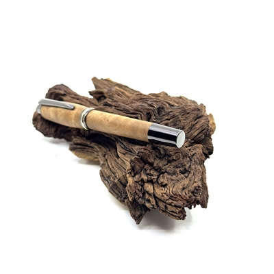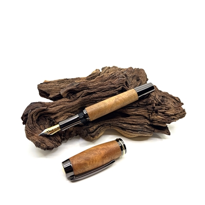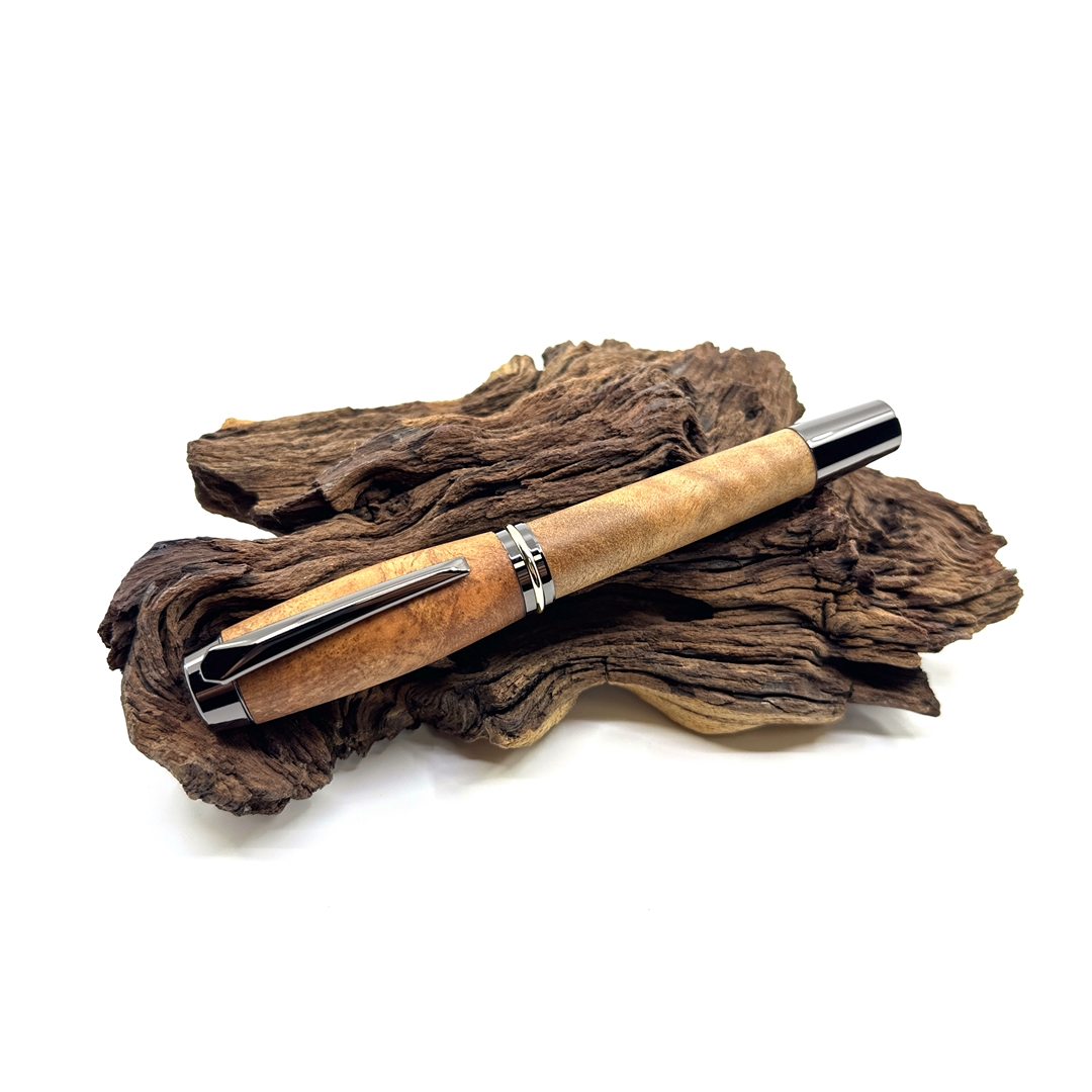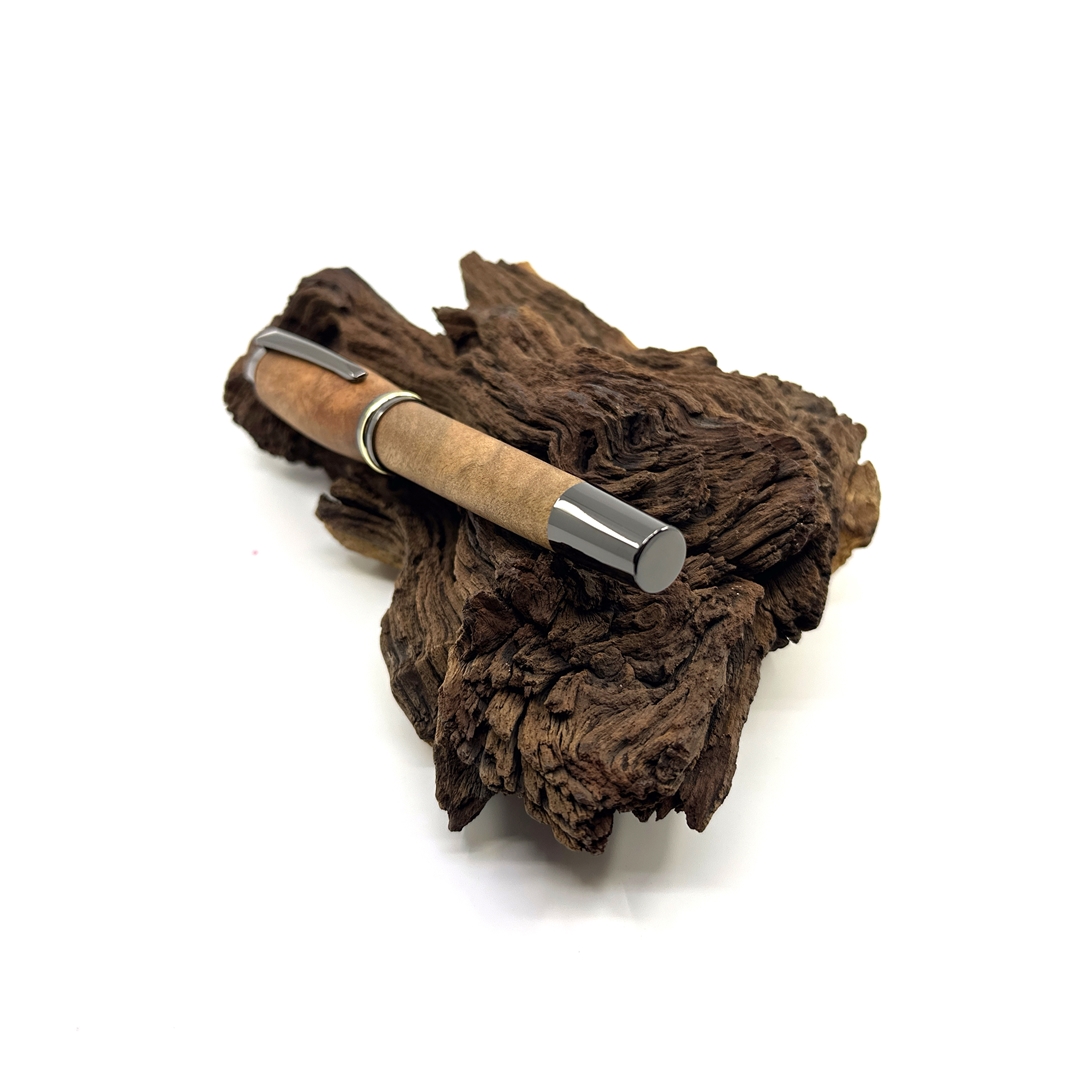 pochází především z východní Asie, kde roste v teplejších oblastech Číny, Japonska, Tchaj-wanu či Vietnamu. Jedná se o stálezelený strom známý svou výraznou, přirozeně kafrovou vůní, která je svěží, lehce mentolová a velmi příjemná. Tato aroma není jen estetická – dřevo je tradičně ceněno i pro své přirozené odpuzující účinky proti hmyzu. Barevně se pohybuje od světle až po středně hnědé odstíny a často vyniká zajímavou, živou kresbou, díky níž je každý kus originál. Struktura dřeva je jemná až středně jemná, což mu dodává elegantní a klidný vzhled. Kafrové dřevo má střední hustotu a velmi dobře se opracovává, takže umožňuje precizní řemeslné zpracování i hladký finální povrch. Na dotek působí teple a přirozeně, bez chladného dojmu typického pro kovové materiály. Právě proto je ideální volbou pro psací pera, která mají nejen dobře sloužit, ale i těšit smysly. Psací pero z kafrového dřeva tak není jen nástroj, ale malý každodenní zážitek.